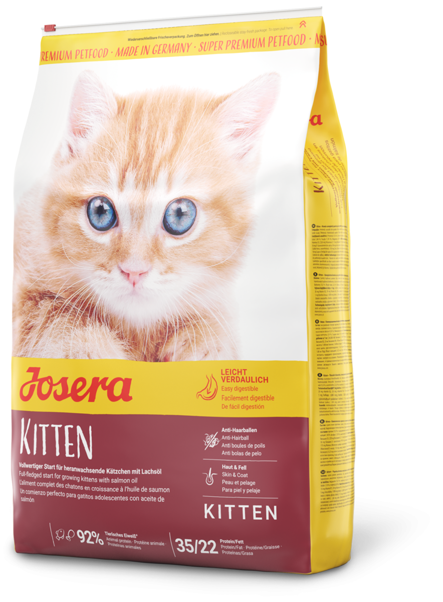 Gerade in der Zeit des Heranwachsens oder während der Trächtigkeit und Säugezeit ist eine optimale Nährstoffversorgung besonders wichtig. Josera Kitten ist ein für diese Phase konzipiertes, energiereiches, leicht verdauliches und besonders schmackhaftes Futter, das den kleinen Kitten genauso gut schmeckt wie der Katzenmama.