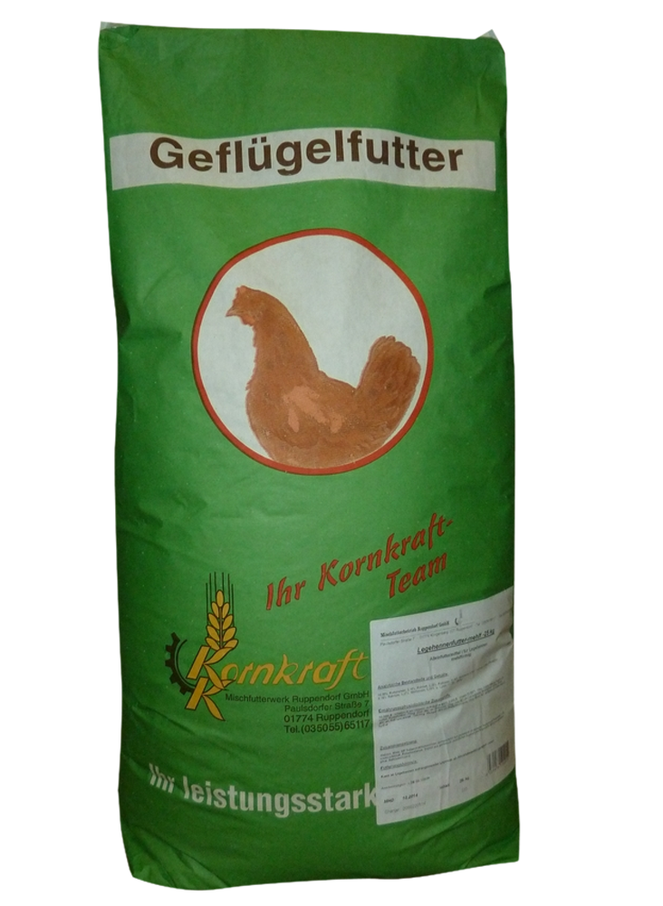Kornkraft Legehennenfutter wird in 3 Konsistenzen angeboten mehlförmig, gekrümelt und 3 mm pelletiert. Eine ausgewogene Mischung von pflanzlichen Proteinen, Sojaöl sowie der synthetischen Aminosäure Methionin garantiert die ordnungsgemäße Versorgung der Legehennen. Das Mischfutter kann an Legehennen mit beginnender Legereife als Alleinfutter gefüttert werden.