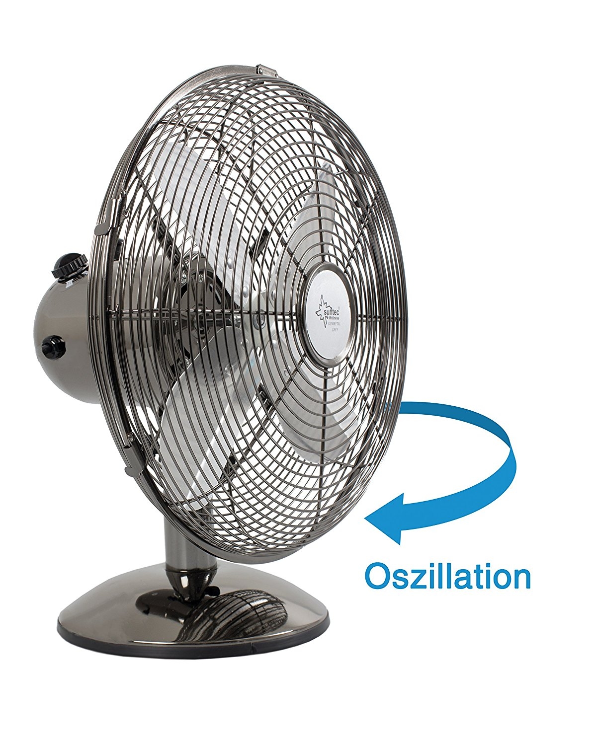Der Suntec Tischventilator CoolBreeze 3.000 TVM - im hochwertigem Metall-Design ist ein moderner Tischventilator mit einem Durchmesser von 30 cm und verfügt über 3 Ventilationsstufen. Auf Wunsch kann Oszillation ein-/abgeschaltet werden. Dadurch, dass der Kopf manuell beweglich ist, sorgt der CoolBreeze 3.000 TVM für angenehme Luft im Raum. So lässt es sich auch an heißen Tagen gut im Haus aushalten. Durch seine massive Bauweise verfügt der Tischventilator über einen stabilen Stand. Die verwendeten Gewichte im Standfuß sind zu 100% aus recyclebaren Materialien hergestellt und der Umwelt zuliebe nicht chemisch gereinigt worden.