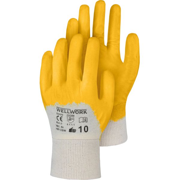 DIN EN 388:2016 Cat. II (4.1.1.1.X), mit Strickbund, Montagehandschuh universell einsetzbar, guter Trocken- und Nassgriff, auch bei öligen und fettigen Kleinstteilen,Material: Baumwolle, Beschichtung: 3/4 Nitril,Farbe: beige, Beschichtung: gelb